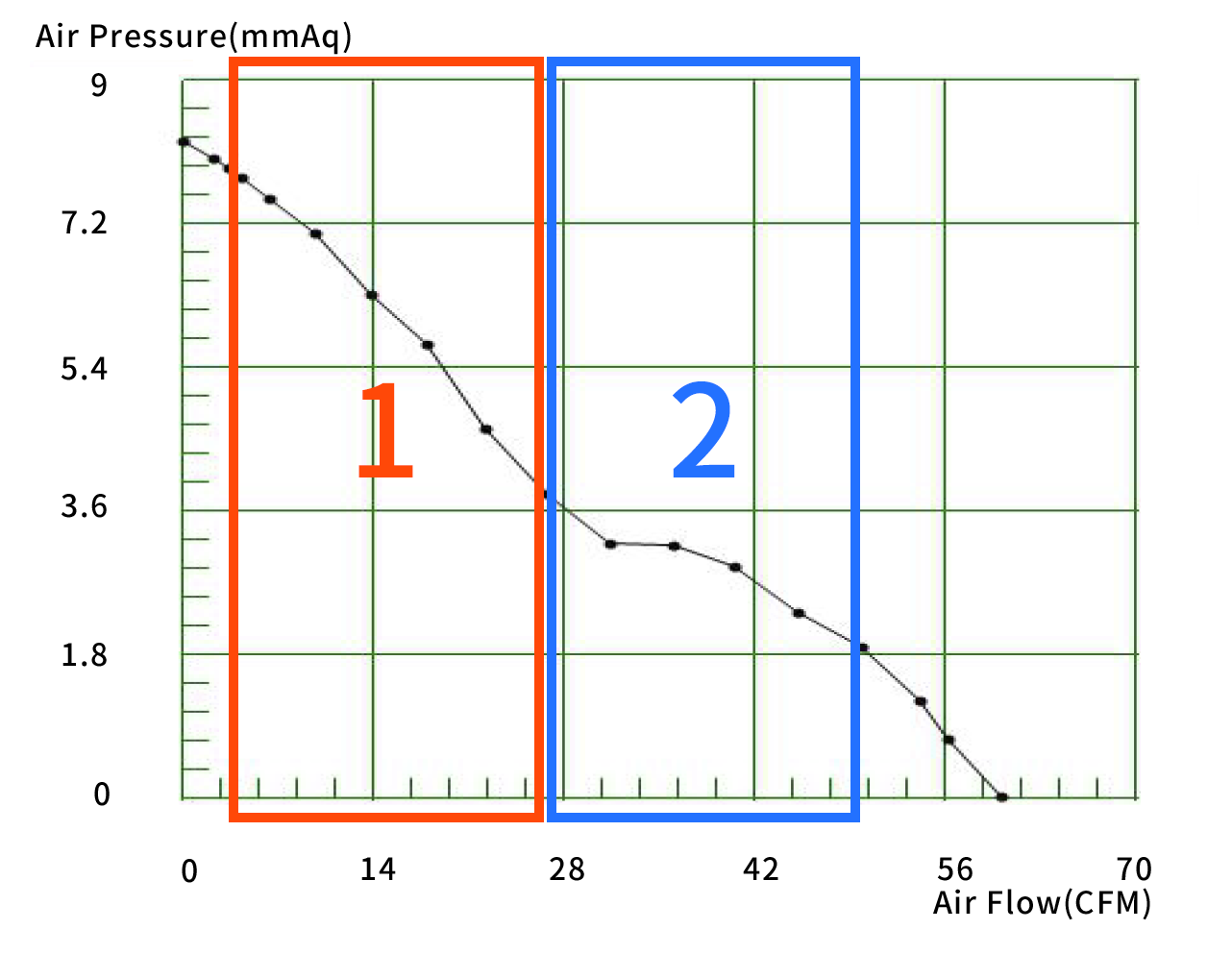 그래프상 각 포인트에서의 풍압(mmAq), 풍량(CFM), 전류(A), 소비전력(Watt), 회전속도(RPM) 위 표에서 보면,
