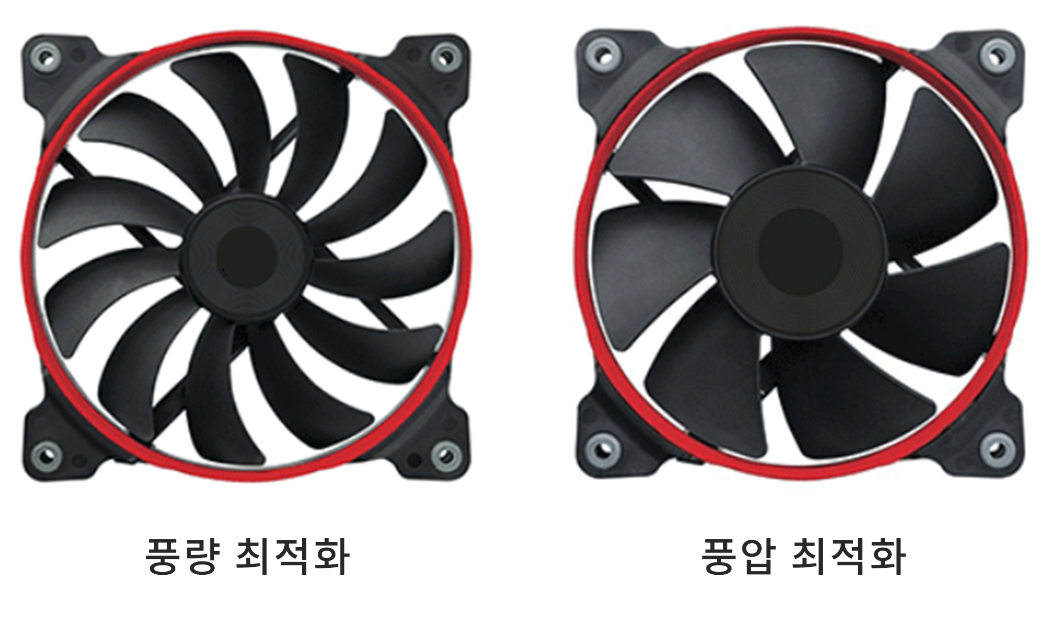 아래 사진의 '풍량 최적화'는 날개가 얇고 날개간 간격이 큽니다.